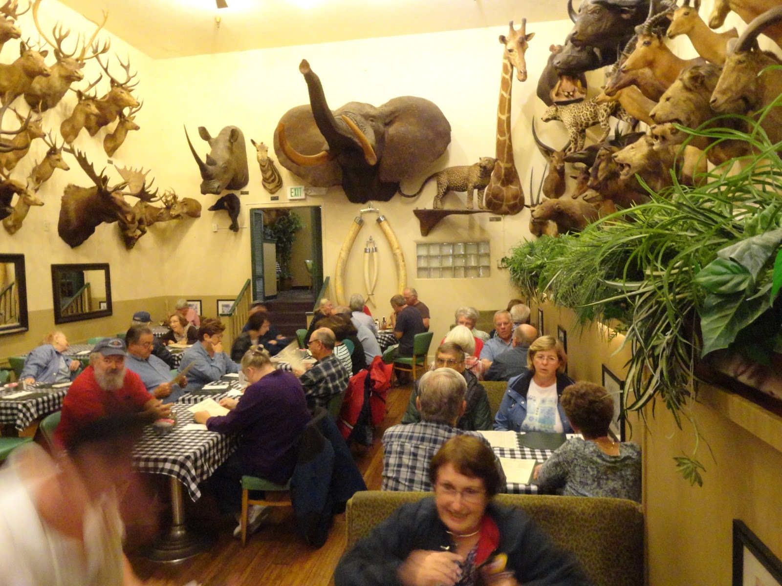 While we were in the Bighorn, the rain was playing havoc with the power grid, the lights in the Bighorn went off and on at least 10 times and finally the whole town went off for good. We finished up lunch, not by candlelight but by cell phone flashlight.  It became a real safari adventure to find the restrooms down a long ramp into the darkness.  And, take away the power and you cannot pay with credit cards. Just like old times, a bill scribbled on a scrap of paper, and pay with greenbacks.  After lunch, it was a rainy drive to the Jelly Belly factory.